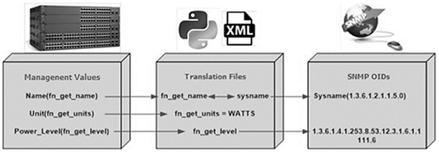 In practice, the SNMP proxy is configured on the port of a switch connected to the SNMP device. An XML file arranged in the memory of this switch will allow the translation of energy requests and vice versa using the SNMP protocol. Obviously, it will be necessary to write a translation file for each different device that you want to control because the SNMP protocol has defined everything in its structural tree. To do this, it is necessary to find the MIB of the team and extracts the OIDs that are interesting and relevant to an extent [20].