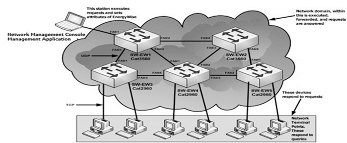 As mentioned, the solution is SNMPv2 compliant, and due to the consideration of the devices used in Testbed for this purpose, the concept used to perform PM is Cisco EnergyWise, which is a proprietary product. The reference of this product established in version 2.7 and higher, such as those used for this purpose, is integrating a new feature, which is the configuration of an SNMP proxy. Therefore, it is possible to review and manage SNMP systems, such as a switch or a router, as if they were native power support terminals without problems [5]. This is indicated in Fig. 2.