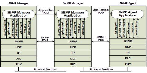 c) Network management systems: A network management system issues requests, and the devices return responses. Network management systems and the respective agents communicate through messages, such as GetRequest, SetRequest, GetNextRequest, GetResponse, and Trap.