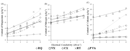 Figure 3: Contents of magnesium (A), nitrogen (B) and calcium (C) in leaf blades of flowering melon irrigated with water of different salinities and in different soil classes: RQ - Typic Ustipsamments; PVA - Typic Haplustults; CX - Typic Haplustepts; RY - Typic Ustifluvents, and VX - Typic Haplusterts.