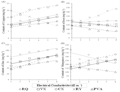 Figure 4: Contents of copper (A), iron (B), zinc (C) and manganese (D) in the leaf blades of flowering melon irrigated with water of different salinities and in different soil classes: RQ - Typic Ustipsamments; PVA - Typic Haplustults; CX - Typic Haplustepts; RY - Typic Ustifluvents, and VX - Typic Haplusterts.