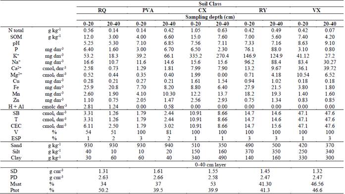 RQ - Typic Ustipsamments; PVA - Typic Haplustults; CX - Typic Haplustepts; RY - Typic Ustifluvents, and VX - Typic Haplusterts; SOM - soil organic matter; SB - sum of bases; T - cation exchange capacity at pH 7.0; CEC - cation exchange capacity; V - base saturation; ESP - exchangeable sodium percentage; SD - soil density; PD- particle density; Msat - saturation moisture; Ptot - total porosity. Source: The Authors.