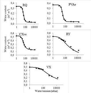 Figure 1: Water retention curves in the 0-20 cm layer of the soils: RQ - Typic Ustipsamments; PVA - Typic Haplustults; CX - Typic Haplustepts; RY - Typic Ustifluvents, and VX - Typic Haplusterts.