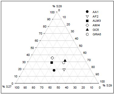 The presence of bisnorhopane (BNH28) in AMI4, GC5 and GRA6 samples suggests a reducing environment [5]. The D27/S27 diagnostic ratio is an indicator of the sedimentation environment and the type of lithology of the parent rock [16]. Fig. 6b shows how GRA6 and GC5 belonging to the same basin stand out for their greater preponderance of an anoxic environment and a carbonate type generating rock. Close to these is AF2, in which a more siliciclastic lithology is observed and an environment with a greater presence of oxygen. In the case of AA1, ALM3 and AMI4 located to the upper right of the graph, the environment becomes suboxic and with a greater siliciclastic contribution. The relationship between the relative percentages of S27, S28 and S29 can be represented by Fig. 7, which is based on the ternary diagram proposed by Moldowan et al. (1985). It allows to visualize that ALM3 and AMI4 are associated to lithology of the marine-type lutites and source rocks of carbonate-type. GC5, GRA6, AA1 and AF2 to carbonate-type source rocks [8].