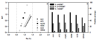 Figure 8: Vitrinite reflectance (Ro) as a function of the Methylphenanthrene Index (IMP) to determine the maturity of the samples (a) and relative percentages of 4-MDBT, 2 + 3-MDBT and 1-MDBT as a function of each sample (b). MDBT: methyldibenzothiophene.