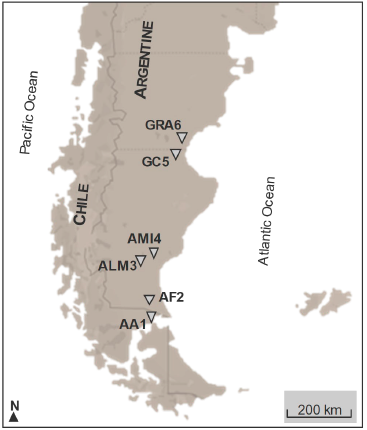 Figure 1: Map of oil sampling locations in southern Patagonia, Argentina. The AA1, AF2, ALM3 and AMI4 locations are from the Austral basin and the GC5 and GRA6 locations are from the Golfo San Jorge basin.