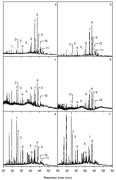 Figure 2: Fragmentograms for ion m/z 191 for samples AA1 (a), AF2 (b), ALM3 (c), AMI4 (d), GC5 (e) and GRA6 (f). On the ordinate axis, the "relative abundance" is observed, and on the abscissa axis the "retention time (min)" is presented. The compounds marked with numbers are: 1 tricyclic terpane (T23), 2 tricyclic terpane (T24), 3 tricyclic terpane (T25), 4 tricyclic terpane (T26), 5 trisnorneohopane (Ts), 6 trisnorhopane (Tm), 7 norhopane (H29), 8 hopane (H30), 9 moretane (M30), 10 homohopane (H31) and 11 gammacerane (G30).