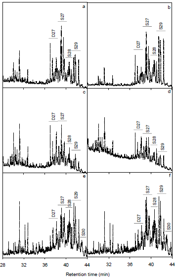Figure 3: Fragmentograms for ion m/z 217 for samples AA1 (a), AF2 (b), ALM3 (c), AMI4 (d), GC5 (e) and GRA6 (f). On the ordinate axis, the "relative abundance" is observed and on the abscissa axis, the "retention time (min)" is presened. The compounds listed are D27 (diasteranes), S27 (cholestanes), S28 (ergostanes), S29 (stigmastanes) and S30 (methylesteranes).