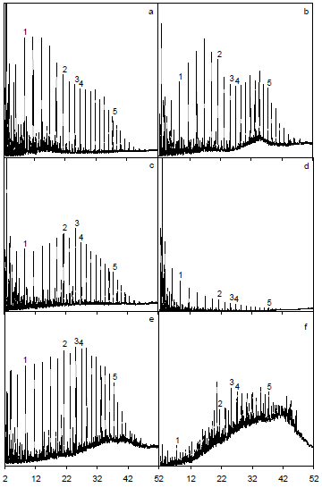 Figure 4: TIC for samples AA1 (a), AF2 (b), ALM3 (c), AMI4 (d), GC5 (e) and GRA6 (f). In the ordinate axis, the "relative abundance" is observed and in the abscissa axis, the "retention time (min)" is presented. The compounds marked with numbers are 1 (hexadecane), 2 (pentadecane), 3 (heptadecane), 4 (octadecane) and 5 (pentacosane).