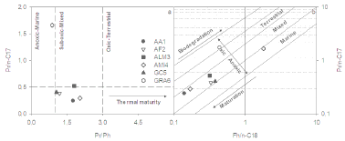 Pristane and phytane are the most important isoprenoids due to the concentration in which they are found in crude samples. The relationship between these (Pr/Ph) and the one obtained from them with their normal alkanes, heptadecane (n-C17) and octadecane (n-C18), provides relevant information [15]. Table 1 and Fig. 4 show that the crude oils AF2, GC5 and GRA6 have a Pr/Ph ratio around 1, suggesting that the origin of the organic matter is predominantly marine [16]. In the case of samples AA1, ALM3 and AMI4 a value around 2 indicates that the origin of organic matter is marine with some contribution of terrestrial type matter [17]. The correlation between the diagnostic rates Pr/n-C17 vs Ph/n-C18 (Fig. 5b) showed that AF2, GC5 and GRA6 have a predominant contribution of organic matter Type II from marine environments. AA1, ALM3 and AMI4 are found in the Type II-III zone, suggesting an important contribution of terrestrial organic matter for these crudes [1].