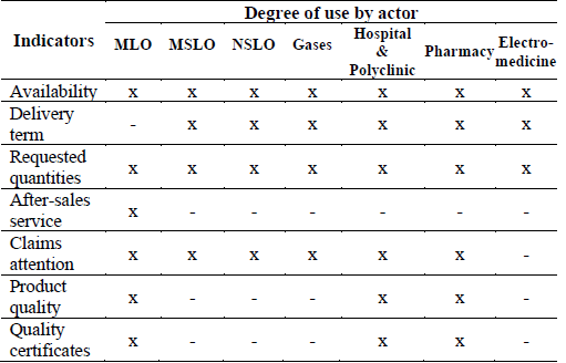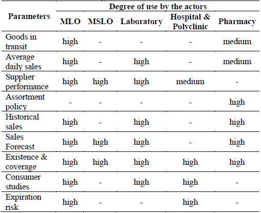 The performance of the supplier's delivery period is used by 70% of the actors, but in a wide variability prevails in terms of use; MLO, MSLP and Industry consider that this parameter has a high use value, the Hospital and the Polyclinic give an average value and the Pharmacy grants a low value. The terms existence and coverage on the unit, are highly used by all actors.