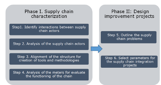 The methodology to be used is an approximation to that developed by Medina Azevedo [27]. It covers two phases: a supply chain characterization and an improvement project design. The Fig. 1 shows the six steps of the methodology.
