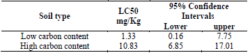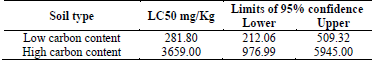 After the test, the state of earthworms in each of the samples was examined. For a soil with high carbon content, a 100% mortality rate was reached at the two highest concentrations evaluated (286839.85 and 28683.98 mg oil/Kg of soil dry weight). In the soil with low carbon content, 100% mortality of the test organisms occurred at concentrations of 158955.83, 15895.58 and 1589.56 mg oil/kg of soil dry weight. The reported mortality for each of the concentrations tested is presented in Table 2 and Table 3.