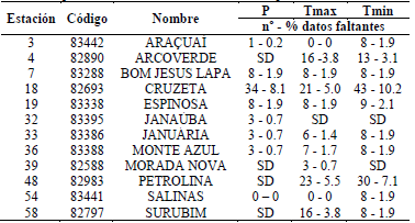 La limitación en la información de base hizo que sólo se reconstruyeran al 100 % las series Salinas (P-Precipitación, Tmax -Temperatura máxima) y Araçuaí (Tmax), así como 10 estaciones con un máximo de 10 % de datos faltantes. No obstante, los test de homogeneidad fueron superados en todas las series, considerándose la información obtenida válida para la caracterización climática de la región.