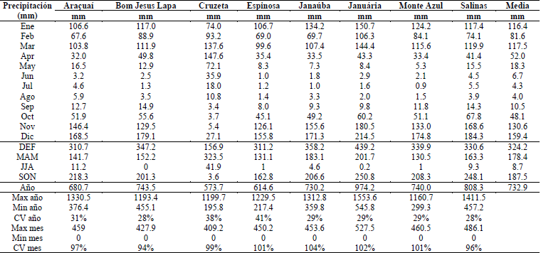 La precipitación media anual entre 1981-2015 fue de 749.9 mm, con una variabilidad interanual en las estaciones del 28-41 %. La aportación máxima anual con 1553.6 mm se registró en la estación más sur-occidental Januária, mientras que la mínima de 195.8 mm se observó en la estación nor-oriental de Cruzeta, en el extremo opuesto (Fig. 1, Tabla 3).