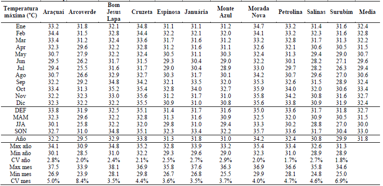 La Tmax media anual fue de 31.7 ºC con una baja variabilidad (CV = 7.6%), oscilando entre 33.5 ºC en octubre y 29.5 ºC en julio. Un valor máximo de 33.5 ºC se registró en la estación sur-occidental de Bom Jesus da Lapa en octubre de 2015, mientras que un mínimo de 23.9 ºC se observó en el observatorio nor-oriental de Arcoverde, en el extremo opuesto de la región (Fig. 3; Tabla 4).