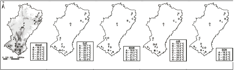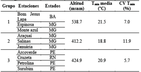 Las estaciones fueron clasificadas según sus temperaturas mínimas medias anuales en una familia de estaciones de baja temperatura en la región sur-occidental y nor-oriental (Januária y Arcoverde), una familia de baja temperatura en la región sur (Salinas y Araçuaí), dos familias de alta temperatura en la región interior sur (Espinosa y Monte Azul) y en la región central y nor-oriental (Petrolina y Cruzeta), así como dos estaciones independientes con temperaturas intermedias en la región central (Bom Jesus da Lapa) y nor-oriental (Surubim).