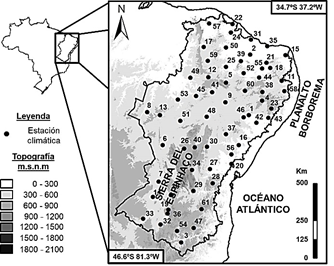 La zona de estudio se emplaza en la región más nor-oriental de Brasil. Está limitada al norte y este por el Océano Atlántico, y al sur y oeste por la región de Brasil continental, cubriendo una extensión de 1,020,470 km2. Debido a su gran superficie, la topografía es bastante irregular, con una altura media de 479 msnm. El relieve presenta una ligera pendiente regional W-SW, con una cota máxima de 2033 m en su zona central-sur que desciende hasta el nivel del mar al norte y oeste (Fig. 1). El clima general se clasifica según Koppen [17] como árido, con los subclimas Semiárido cálido (BSh) y Árido cálido (BWh) predominando en la región central, así como Tropical con invierno seco (Aw) en zonas topográficamente más bajas.