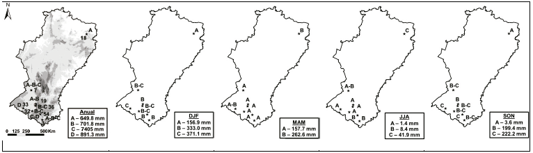 Aunque de manera general la lluvia en el semiárido presentó un similar comportamiento, se distinguieron familias de estaciones en diferentes intervalos temporales. Anualmente se diferenciaron hasta cuatro grupos de estaciones, si bien no resultaron del todo significativos al asociarse los mismos puntos en diferentes grupos. A pesar de ello, se identificaron con una menor ocurrencia precipitación las estaciones Cruzeta, Espinosa, Araçuaí y Bom Jesus da Lapa (649.8 mm), frente a las de máxima lluvia Salinas y Januária (867.9 mm; Fig.2).