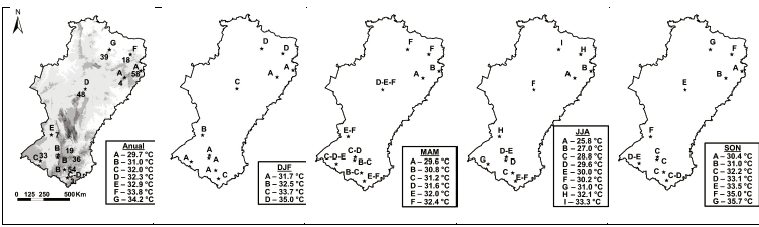 Así mismo, aunque se generaron conjuntos de estaciones con similar comportamiento trimestral, los grupos estuvieron heterogéneamente distribuidos y presentaron una alta variabilidad. De este modo, en DEF se distingue un conjunto de observatorios de menor Tmax en la región nor-oriental (Surubim y Arcoverde) y sur-occidental (Salinas, Monte Azul, Espinosa y Januária) y dos familias con mayor temperatura ubicadas en las regiones central (Araçuaí, Petrolina y Bom Jesús da Lapa) y nor-occidental (Cruzeta y Morada Nova) del semiárido.
