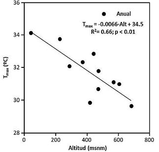 Por último, aunque la Tmax trimestral presentó una alta variabilidad, a escala anual fue posible definir una relación entre la altitud a la que se encontraban las estaciones y su Tmax, la cual desciende a una tasa de 0.66 ºC/100 m (Fig. 4).