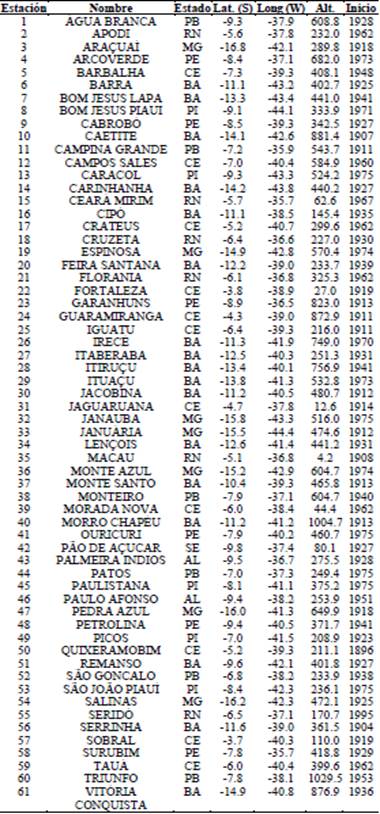 Así, aunque la distribución de las estaciones climáticas en el semiárido brasileño no fue la óptima, con observatorios separados más de los 100 km recomendados, fueron construidas 29 series homogéneas de clima para la caracterización pluviométrica y térmica de la región.
