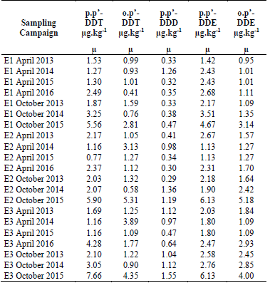 By comparing concentrations of DDTs sorbed in sediments of the Tucutunemo riverbed (Table 4), which varied between 10-1 - 101 µg.kg-1 with those reported in 20 studies presented in the Table 1, ranging from 10-1 to 101 µg.kg-1, it was found that the variation was not significant. The concentrations of DDTs in sediments were higher in the dry season than rainy season in an order from 2 to 6 times. The highest values were found for p.p’-DDT and p.p’-DDE (Table 4).
