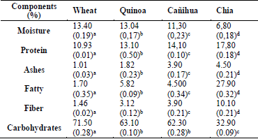 Wheat flour for baking, quinoa seeds and cañihua seeds were obtained from the market in the town of Nuevo Chimbote, Ancash, Peru (9 ° 7'27.01 "S and 78 ° 29'51" W). Chia seeds were harvested in Yungay, Ancash, Peru (09 ° 08 ′ 20 ″ S and 77 ° 44 ′ 40 ″ W). Moisture was determined by the gravimetric method in an oven (POL.EKO, model SLW-115STD, USA) with AOAC 931.04. Protein content was determined according to the Kjeldahl AOAC 2001,11 method in a kit (Foss-Labtec ™ LINE, China). The fat content was obtained in a grease extractor kit (Foss, model SOXTEC ™ 2043, China), using petroleum ether as a solvent according to AOAC 963.15. The ashes were calculated by incineration of the organic matter in a muffle (Thermo Scientific ™, Barnstead Thermolyne ™ model, USA), based on AOAC 972,15. The fiber determinations were carried out according to the NMX-F-090 method. 1978 in a FOSS unit (model Fibertec ™ 1023, China), which is based on the acid and alkaline digestion of the sample, obtaining a residue of raw fiber and salts that with subsequent calcination determines the raw fiber. Finally, the carbohydrate determination was made by difference: % Carbohydrates = 100 - (% Proteins +% Fats +% Ash +% Fiber +% Moisture).