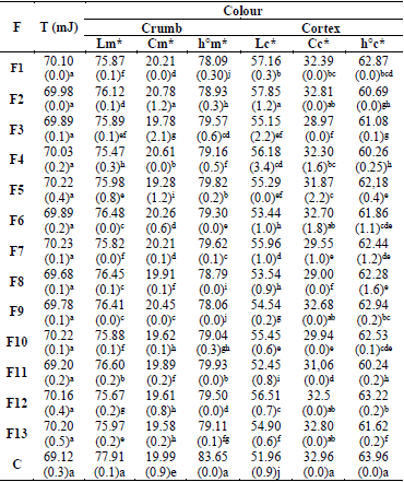 The values of the shade angle for the crumb (h°m*) of the formulations presented lower values with respect to the control and at the same time presented significant differences (p<0.05), for the crust (h°c*) the formulations also presented lower values than the control (p<0.05), values close to 90° equivalent to a yellow color with a slight inclination to red color. In general, the color of the crumb is related to the color of the flours [21]. The color of the crust ranges from intense golden brown at the top to slightly golden brown, due to Maillard's reactions and the caramelization of sugar [37].
