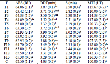 The farinogram establishes the behavior of the flour during the bread making process (Table 5). It shows the elasticity and plasticity of the dough when it is subjected to continuous mixing at constant temperature [38]. The results show that for the water absorption parameter (ABS) the substitutions (62.93 - 65.5 BU, Brabender Units) presented significant differences (p<0.05) with respect to the control (25.5 BU), the presence of proteins especially quinoa and cañihua could compete for the absorption of available water in the masses [39]. Flours that exhibit ABS values of less than 55% are not recommended for baking since it does not allow the development of essential phenomena to obtain quality products [30].