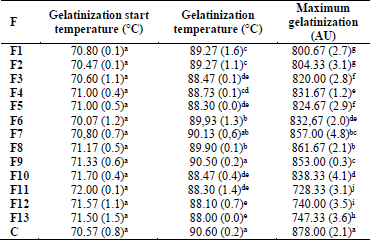 Rodriguez et al [30] found significant differences with respect to the maximum gelatinisation for wheat flour (1249 AU) with different levels of substitution of extruded sacha inchi cake (630 - 986 AU). Recent studies indicate that one way to improve the rheological properties of breads based on wheat flour substituted with other protein sources such as lentil flour depends on the granulometry, since a coarse fraction can provide higher yields compared to unfractionated flour or to flours with finer fractions [9].