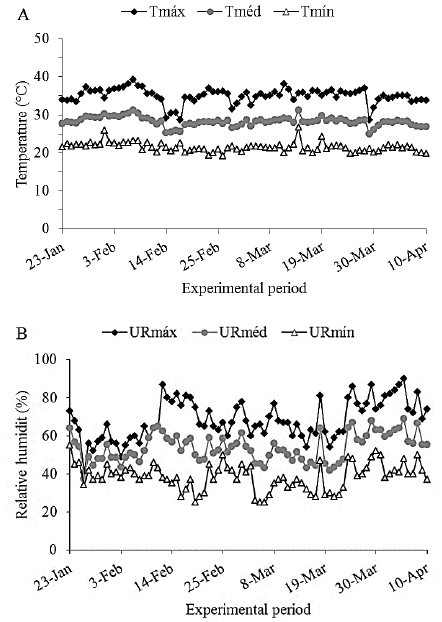Figure 1: Maximum, medium and minimum temperatures (A) and maximum, average and minimum values of relative humidity (B) in the greenhouse during the experimental period.