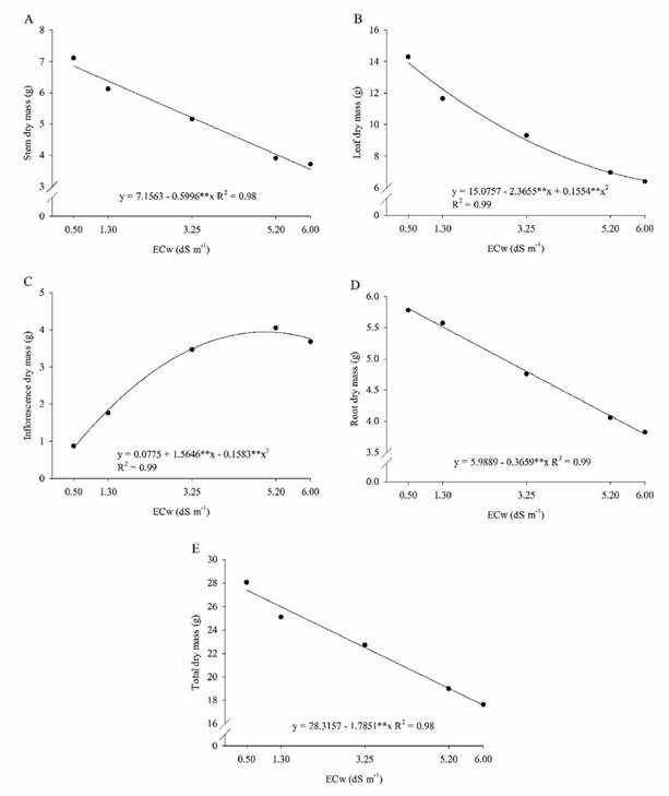 Figure 3: Stem dry mass (A), leaf dry mass (B), inflorescence dry mass (C), root dry mass (D) and total dry mass (E) in basil (Ocimum basilicum L.) submitted to salinity in the irrigation water (ECw).