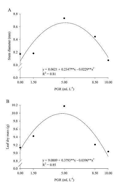 There was a quadratic response, with a maximum stem diameter value (8.73 mm) obtained in the dose of 5.12 mL L-1. From this concentration on (5.12 mL L-1), the stem diameter values started to decrease, and the minimum value (8.07 mm) was observed at the highest growth regulator concentration (10.00 mL L-1).