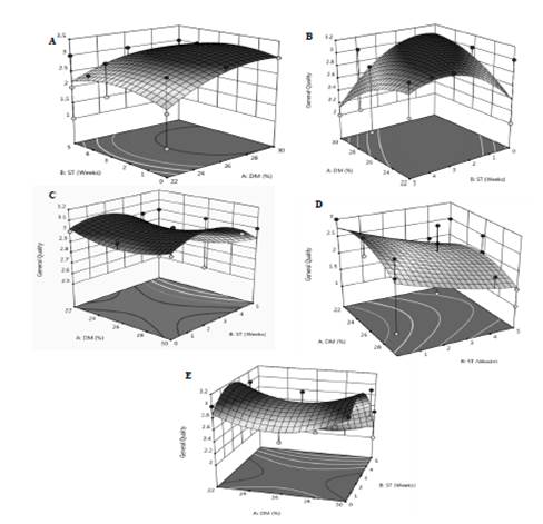 Quadratic models have been applied to modeling the overall acceptability scores on avocado pulp [24]. In this work, surface responses methodology was used to stablish the effect of HI and ST on GQ. GQ is influenced by the orchard location, so that orchard order for GQ was O3 (3.26), O2 (2.81), O1 (2.76), O5 (2.71) and O4 (2.17). The GQ of the avocados at 22% DM is lower than that of fruits at 26 and 30% DM (2.58±0.05, 2.75±0.05 and 2.72±0.5, respectively). ST reduced fruit GQ, especially for O3, O4, and O5 (Fig. 5). GQ for O1 was significantly affected by the DM and the quadratic effect of DM, and the best GQ was found at 29% DM and 3 weeks of ST (Fig. 5A). For O2, a significance was observed for the effect of DM and the quadratic effect of DM, and 29% DM and 1 week of ST were the optimal values for GQ (Fig. 5B). In the response surface analysis, the quadratic effect of DM and ST had a significant effect on GQ for O3, and the optimal GQ was found at 28% DM and 1 week of ST (Fig. 5C). GQ was reduced with ST for O4, and the best factor combination (HI x ST) was 27% DM and 0 weeks of ST to achieve better sensory quality (Fig. 5D). Finally, ST as the main factor, and the quadratic effect of ST had a significant effect on GQ for O5, and the optimal GQ according to response surface could be found at 27% DM and 1 week of ST (Fig. 5E).