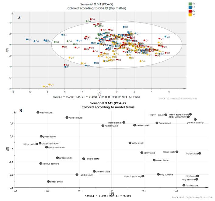 Figure 1: Principal component analysis biplot chart for DM and sensory descriptors: A) score scatter plot and B) loading scatter plot.