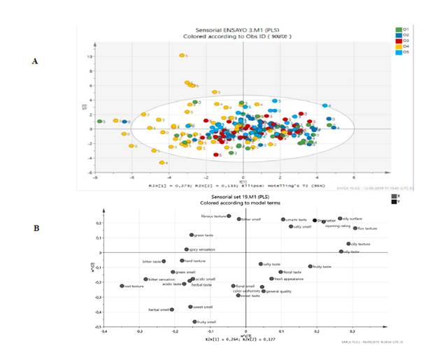 Our work differs from previous researches because of the use of the sensory profile test by multidimensional approach instead of the preferences test and the multivariate data analysis approach. This sensory test is often applied for detailed description of the sensory characteristics of a product. In this method, an assumption is accepted that sensory quality is not a single attribute, but it is a complex of many descriptors which can be individually estimated by a panel [17]. Moreover, in sensory analysis, it is common not to observe differences among means when a test of liking of an attribute is assessed because data have a great variability but if an PCA or PLS are applied to data, remarkable differences can be observed in a 2D scatter and loadings plots [18].