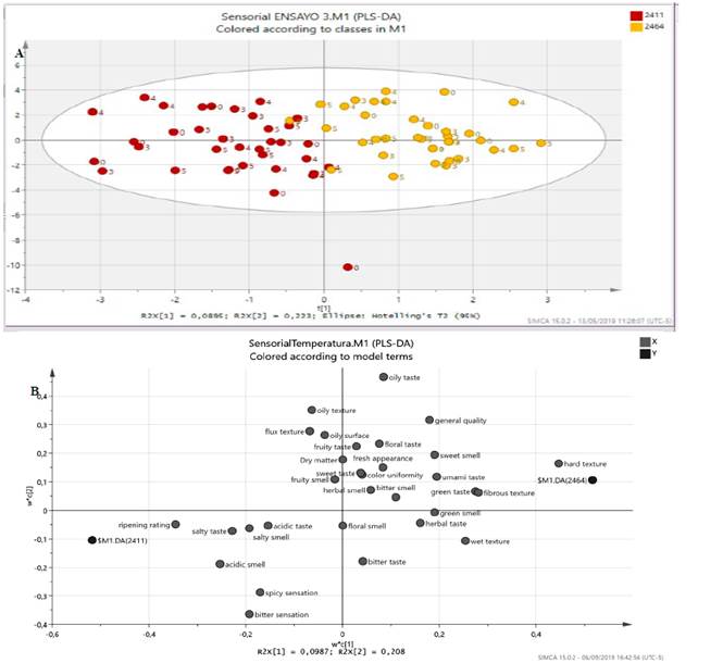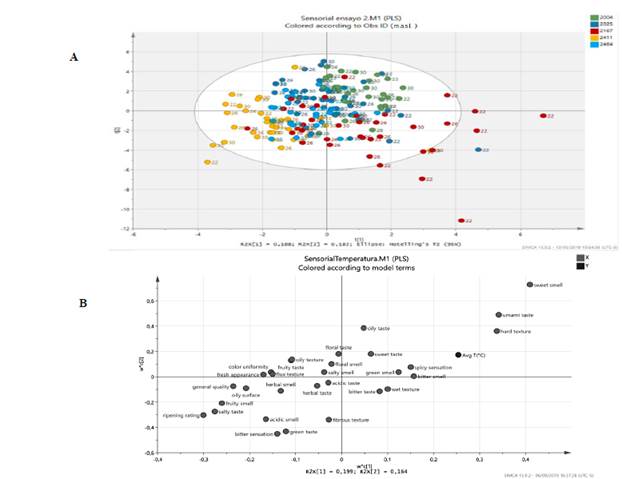 PLS Regression is useful in sensometrics when predictive variables are intercorrelated. Furthermore, it may be useful to guide the selection of a subset of relevant attributes from the complete set of attributes [21]. In this case a PLS model was used to establish descriptors related to DM. Fig. 2, represents the score and loading scatter plots of PLS. The main influential descriptors for the model were selected for the VIP scores (score cutoff 1.0), which were wet texture, fruity smell, flux texture, herbal smell, oily taste, bitter sensation, bitter taste, oily texture, umami taste, sweet taste, general quality, fruity taste and oily surface. Low DM values are related to a wet texture, bitter sensation, and bitter taste. High DM values are related to flux texture, oily taste, oily texture, and sweet taste. It was also seen that the fruit farmer has an effect on the sensory quality.