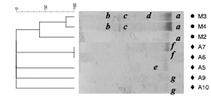 Figure 1: Dendogram and TTGE gel banding patterns of 16S rDNA PCR products from the total fraction of samples taken from industrial (M) and artisanal (A) plants. Positions (a, b, c, d, e, f, g) in the lanes represent the bands selected for identification. The identity of each band is shown in the Fig. 2.