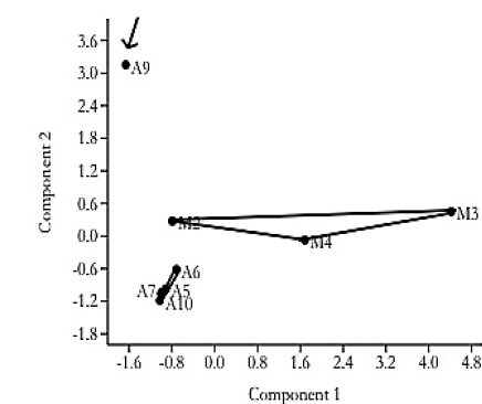 Figure 3: NMDS analysis of the TTGE quantitative matrix. The samples are named according to their place of origin, "A" for the artisanal plant and "M" for the industrial plant.