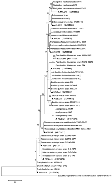 The isolates were characterized microscopically by gram staining and molecularly by RISA (or IGS). All strains, excluding the A9LBA21, were gram positive. RISA analyses showed differences in the pattern of bands. Twenty isolates were identified by 16S rDNA sequencing Fig. 4. Culture dependent methods displayed genera, such as Bacillus sp., Rhodococcus sp., Microbacterium sp., Alcaligenes sp., Lysinibacillus sp., Pisciglobus sp., Trichococcus sp., Paenibacillus sp., Enterococcus sp., Aerocuccus sp., Brachybacterium sp. and Tessaracoccus sp.