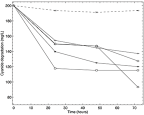 To date, several reports have described the ability of microorganisms to grow on cyanide compounds; bacterial communities such as Pseudomonas, capable of degrading cyanide 10 mg L-1[10] and two isolates of this genus, immobilized on activated charcoal, degrading concentrations up to 340 mg L-1[10,11].Arthrobacter sp., Zoogloearamigera, Acidovorax sp., Achromobacter sp., Janthinobacterium sp., Klebsiella sp., Bacillus pumillus, Burkhoderia cepacia, Alcaligenes sp., Serratia marcescen and Rhodococcus sp., among others, have been reported as cyanide degrading organisms [6, 12-19]. Besides bacteria, species of the archaeal genus Methanosarcina (under anaerobic conditions), some fungi like Fusarium solani and Trichoderma polysporum at pH 4 [20] and some algae like Scenedesmus obliquus[21] have been reported to degrade cyanide.