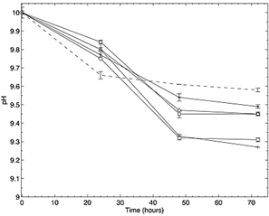 Figure 6: Change of pH in the time lapse of the degradation assay in LB medium using Bacillus pumilus (Bp), Rhodococcus corynebacterioides (Rc), Enterococcus hirae ( Eh) and Tessaracoccus oleagri ( To) isolates, a positive control with the strain P. fluorescens (DSM7155) (PfC +) and a negative control without inoculum ( Control-).