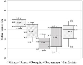 Málaga Bridge shows that 50% data ranges between 46.5 and 50.3 of surface hardness rate, an interquartile range of 3.8 showing that ranges are close, and value dispersion is low when compared against graphics for other bridges. In contrast, Roquemayu presents the highest interquartile range, 3.8, thus showing a wide value dispersion for surface hardness rate.
