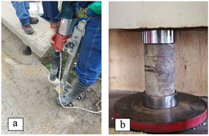 Figure 10: a) Core extraction, and b) Compression Test - Ronquito Bridge