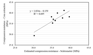 A model that relates compression resistance in both core and sclerometer testing was found. Although limited, it generates a starting point for further studies in these structures.