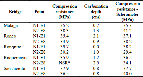 Table 3 shows results for core extraction, compression resistance and carbonation depth. Additionally, resistance values were added to estimated compression according to surface hardness rate for points E1 and E8. Even though resistance estimation through models reported in literature, -including the manufacturers-, is not completely reliable [23], in this case, they will only be used to be compared against values obtained. It is worth mentioning that estimated values for compression resistance were corrected for carbonation depth, following manufacturer’s recommendations [36].