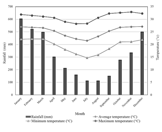 The study area, Chapare Region in Bolivia, is located in a subtropical area, characterized by high relative humidity and constant rainfall, 3801 mm per year. Average annual temperature is 25.2°C [26]. Fig. 2 summarizes historical data for rainfall and temperature in the region during 1982-2012 period.