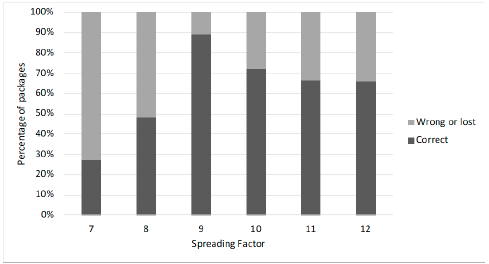 Fig. 9 evidenced that there is a trend of correctly received packages between the bandwidth of 62.5 kHz and 250 kHz, with a probability of success of 79% for 62.5 kHz, 82% for 125 kHz and 82% for 250 kHz. For the other bandwidths, a low reception of correct packages was found with 63% success for 31.25 kHz and 42% success for 41.7 kHz. Fig. 10 shows the discrimination per SF, noting that on this occasion the trend is no longer so evident. The highest success of packages received was at SF = 9 with 95%, followed by SF = 10 with 83%. The other SF values maintain a probability of success below 80% and very close to 70%, which is considered a low reception rate. For SF = 7, there was a 65% success, for SF = 8 it was 73%, for SF = 11 it was 72% and finally for SF = 12 it was 71%.