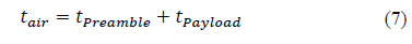 In eq. (8), n is the number of symbols in the preamble, which has the value of 8 by default, and T s is the time it takes for each symbol to be transmitted. The value of t Payload is defined in eq. (9).